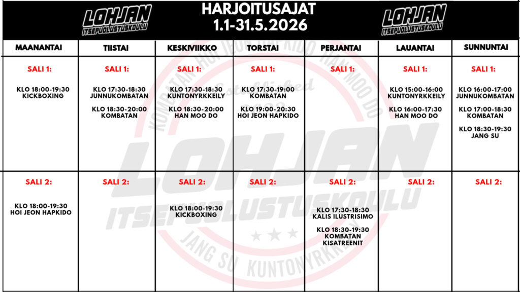 Lohjan Itsepuolustuskoulun harjoitusajat 1.1-31.5.2026